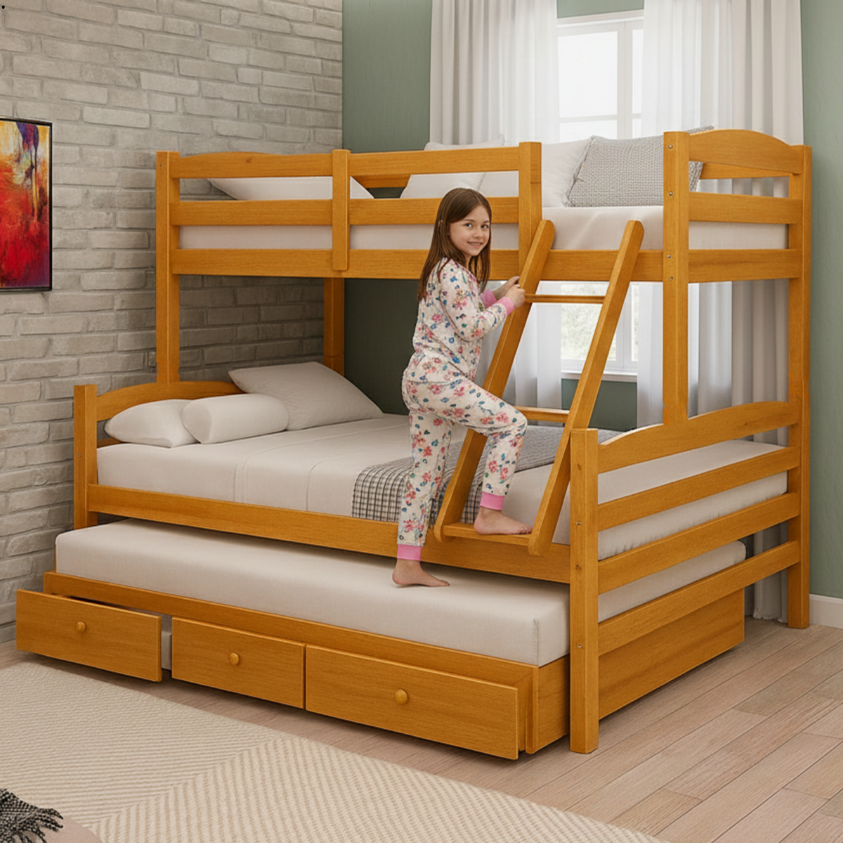 A Treliche de Casal com 3 Gavetas é a solução ideal para quem busca praticidade e otimização de ambientes, reunindo três camas completas em um único móvel. Seu design moderno e funcional atende tanto quartos compactos quanto dormitórios compartilhados, oferecendo conforto e organização sem ocupar grandes áreas. Está disponível nas cores Branco, Castanho e Mel, permitindo combinar facilmente com diferentes estilos de decoração.